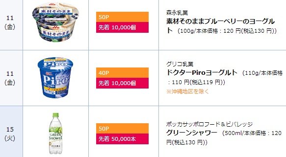 毎日先着順で新製品がお試しできて、例えば4月11日だと110円のヨーグルトが40ポイントで引き換え可能となっています。