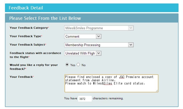 Your Feedback:おれJGCプレミアムだからトルコ航空にステータスマッチさせてくれ。