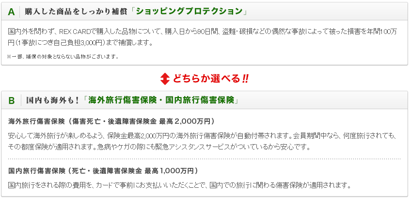次にREXカードは「旅行傷害保険」と「ショッピングプロテクション」を選択可能です。