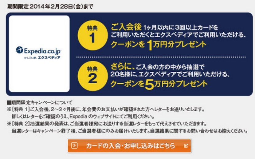 2014年2月28日までの期間限定で入会1ヵ月以内にクレジットカードを3回利用すると年会費相当のエクスペディアの1万円分のクーポン券を貰えるキャンペーンを実施中です。