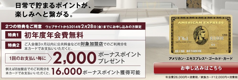 2014年3月31日までの期間限定でアメリカンエキスプレスゴールドカードが初年度年会費無料と公共料金の引き落としを移行する事で最大16000ポイント貰えるキャンペーンを実施しています。