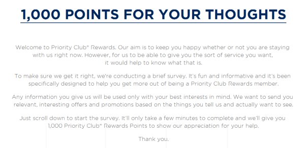 インターコンチネンタルホテルやクラウンプラザホテルのグループであるプライオリティクラブではアンケートに答えると1000ポイント貰えるキャンペーンを実施中です。
