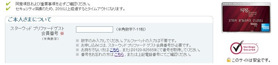 事前にSPG会員番号が必要なんですね。アメックスプラチナカードでもらえるSPGゴールドは新規でも会員番号払い出ししてくれるんですがこれ結構時間かかるんですよね。