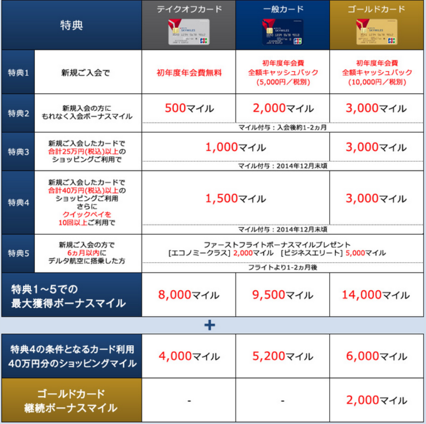 そして今らなテイクオフカードで12000マイル、一般カードで14700マイル、ゴールドカードなら最大22000マイル貰うことができます。