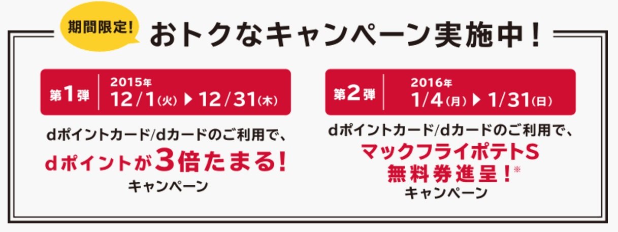 去年はローソンで1本無料で黄金チキンを貰ったdポイントのキャンペーンですが、今年は1月4日からマクドナルドでお買いものをしてdポイントカードを提示するとマックフライドポテトSのクーポン券が貰えます。