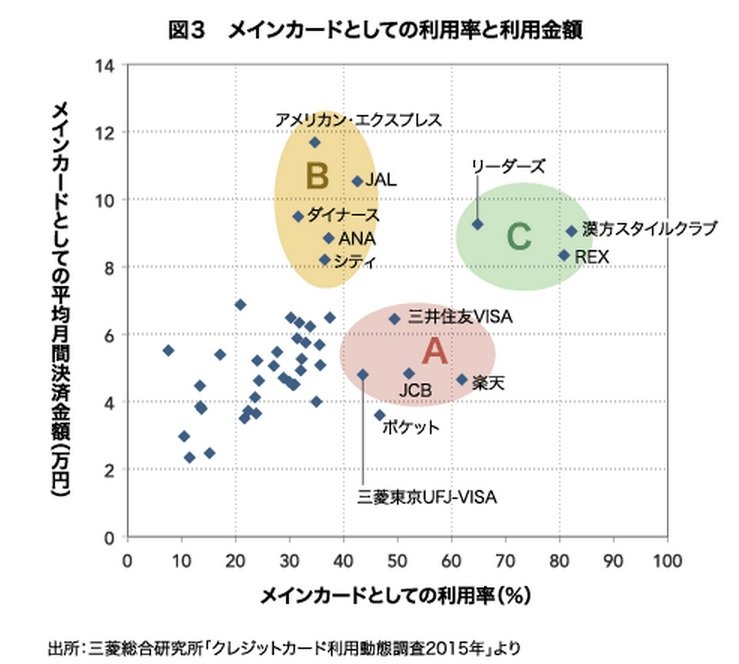 三菱総合研究所のクレジットカード利用実態のコラムをみていたら各カードの利用率と決済額が乗っていました。